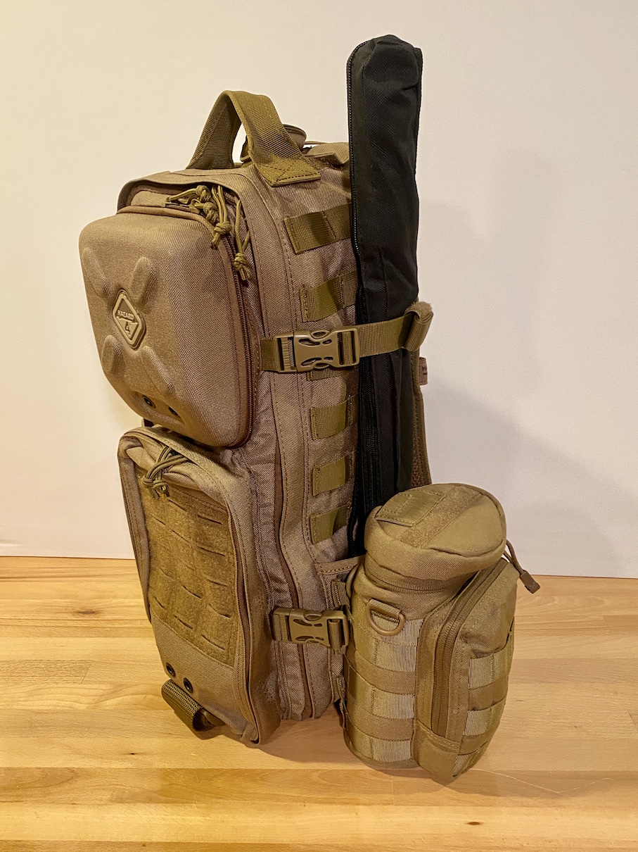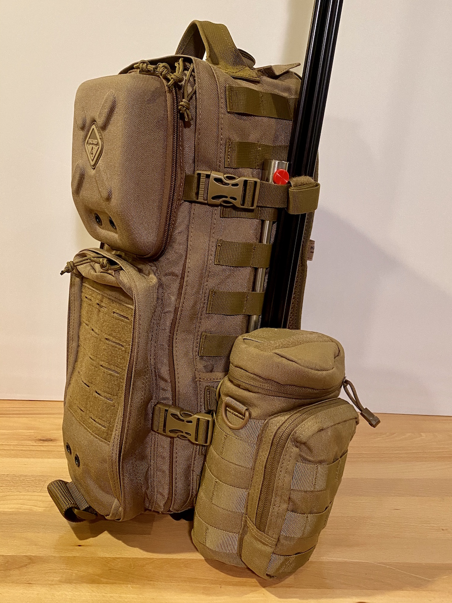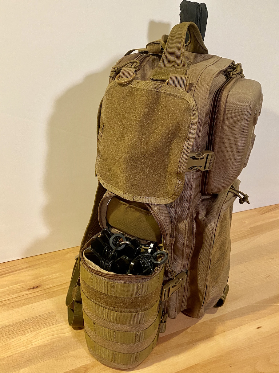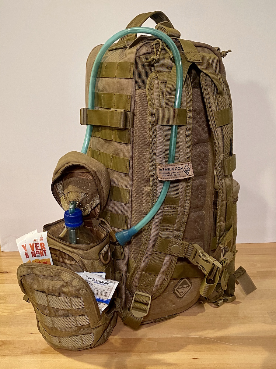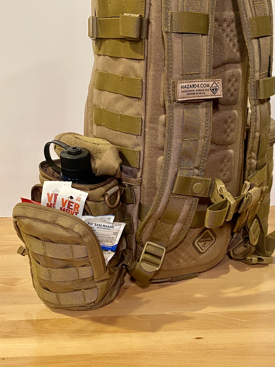 I also need a place to store water and snacks, so I put the Condor H2O Pouch on the other side. I like this pouch because it includes a zippered pocket where I keep some snacks and, now that coronavirus is a thing, a mask and PDI Sani-Hands medical grade hand sanitizer wipes.