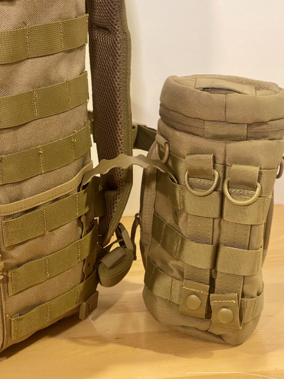 Below are some pics showing some different ways to use the hook and loop panel, and comparing three options for a water bottle or photo lens pouch.