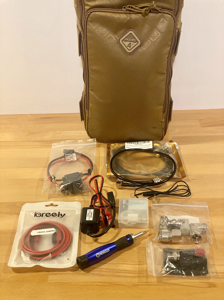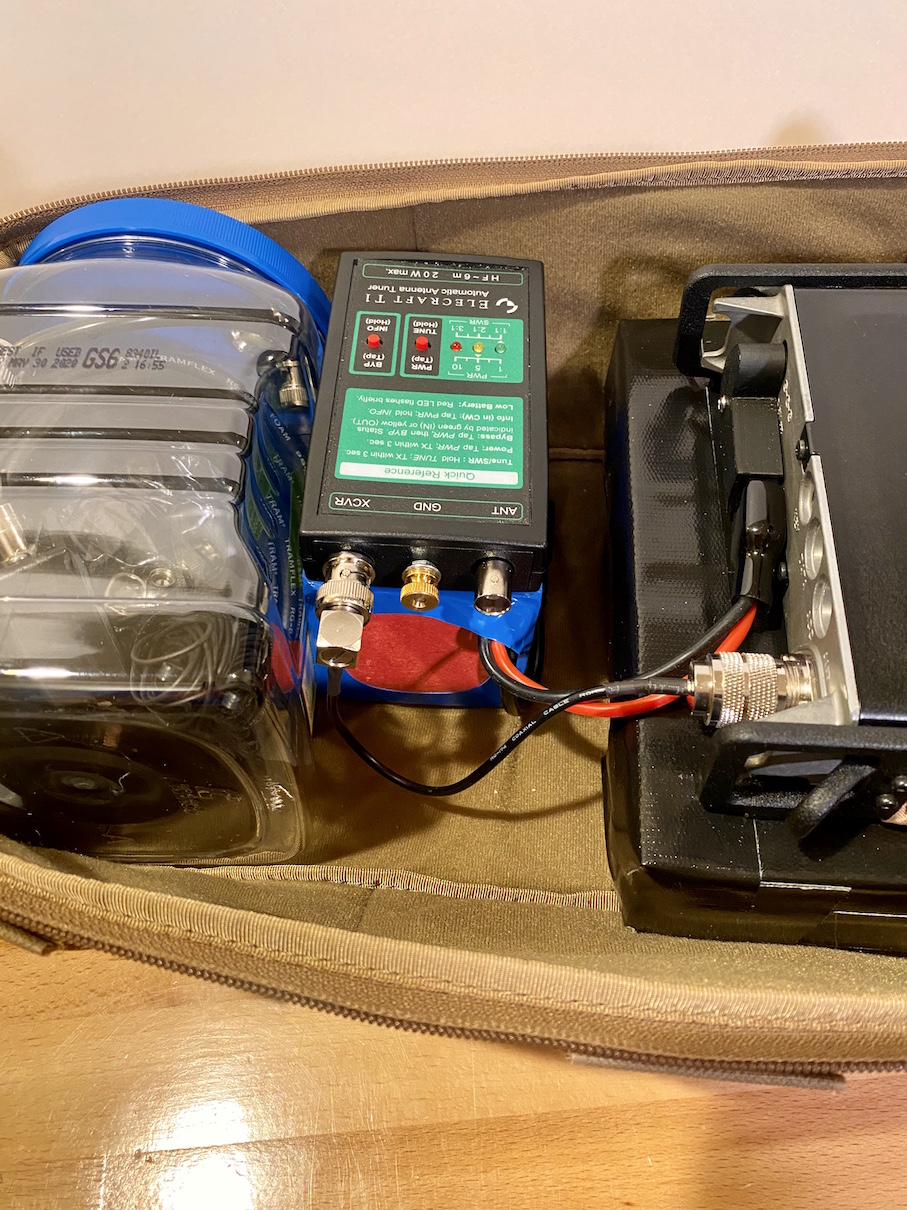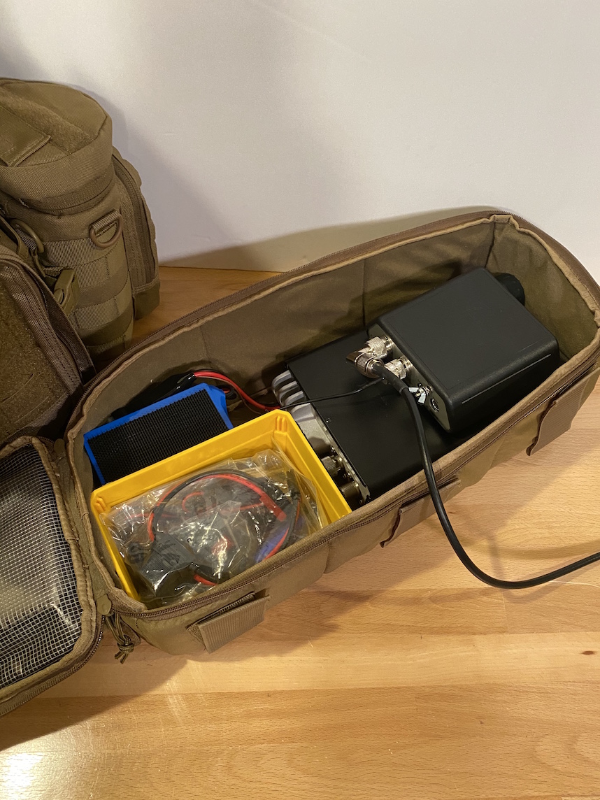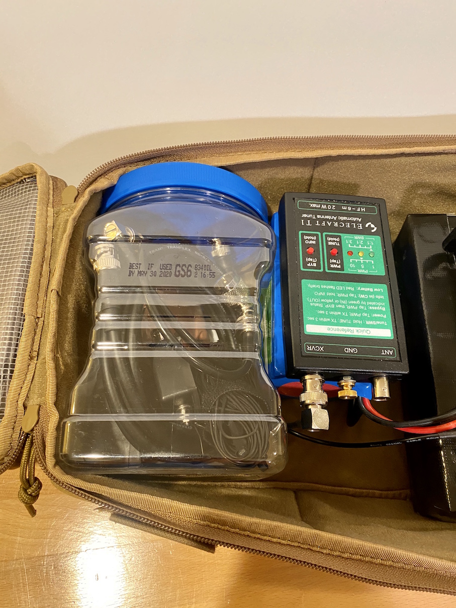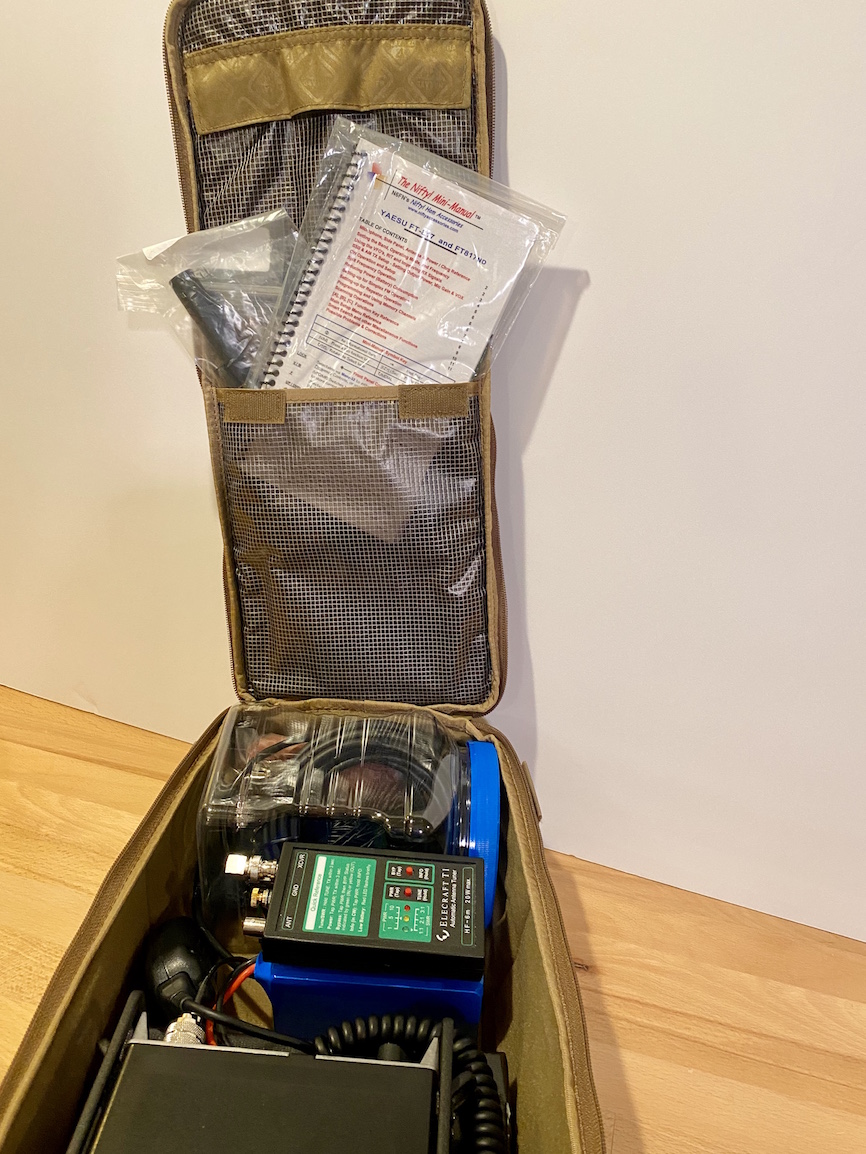 Complete package, including radio, antenna tuner, LiFePO4 battery and charger, admin (manuals, paper, pens), etc., in one easy grab-and-go kit. Antenna may or may not be part of the kit depending on the goal, but for this build I used the Par EndFedz EFT-10/20/40 Trail Friendly.