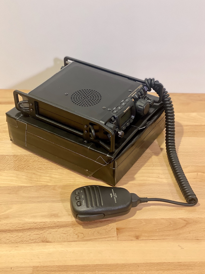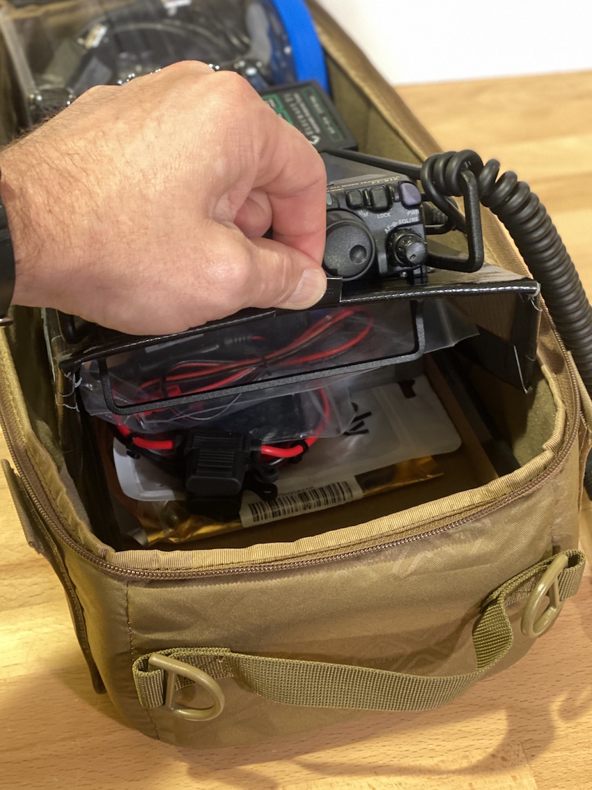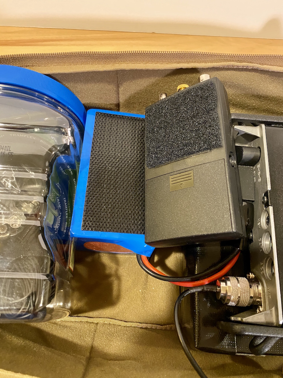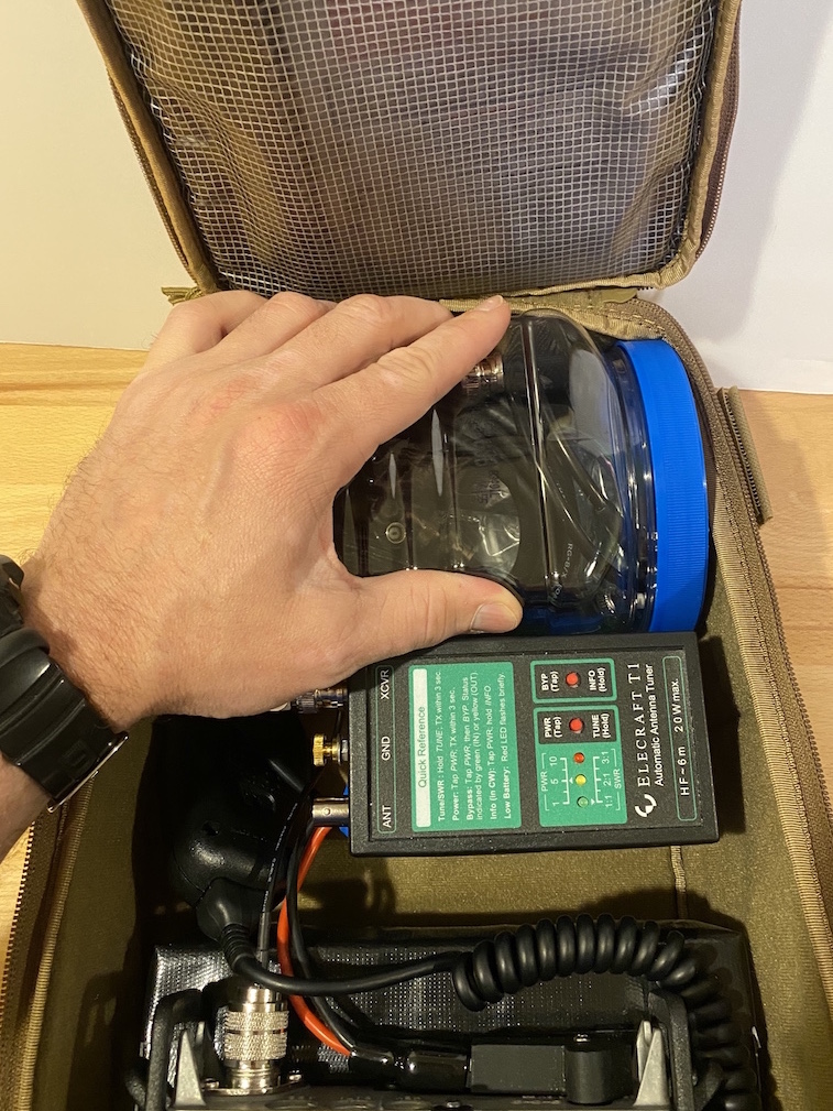 The LDG z817 tuner is about the right height to put under the radio. If I were building this kit, I would probably velcro the tuner to the insert and then velcro the radio on top of the tuner. If the radio is not exactly centered over the tuner, there's some space underneath the radio where the microphone would fit. But there are probably other creative ways to set it up, especially if the battery had different dimensions. Point is, it fits.