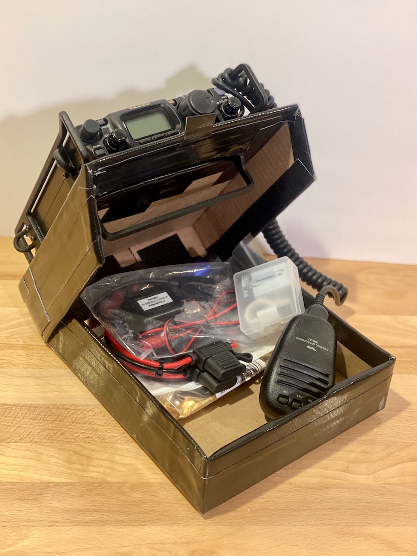 The riser box not only needs to support the radio from bottom, but for best protection it should snug the top of the radio against the insert's closed lid when it's packed up. This meant I needed to raise the radio about 2.5"-3". I looked around for ideas and found some acceptable ones (described in the parts list above), but decided to make a custom one out of a double-currogated cardboard box.