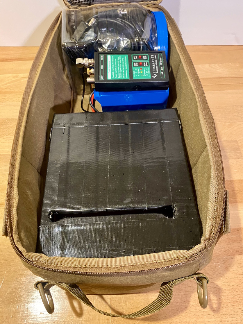 Bioenno 6Ah LiFePO4 Battery is a great size for this project. It is big enough for the velcro to get a solid purchase on the insert to hold the rear container in place, but small enough to leave some space for other items. I put the microphone in that space. Their 4.5Ah battery will also fit and it's a little cheaper. You might want to put velcro on the bottom and wall side if you use the smaller battery.