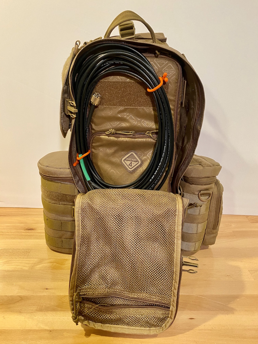 The MPAS requires counterpoises, which fit in the Jelly Roll (first pic below). Also, the MPAS normally uses a double UHF-male antenna cable. The second pic below shows that there's room in the pack, outside the insert, to hold a lot more antenna cable than I showed in the main article.