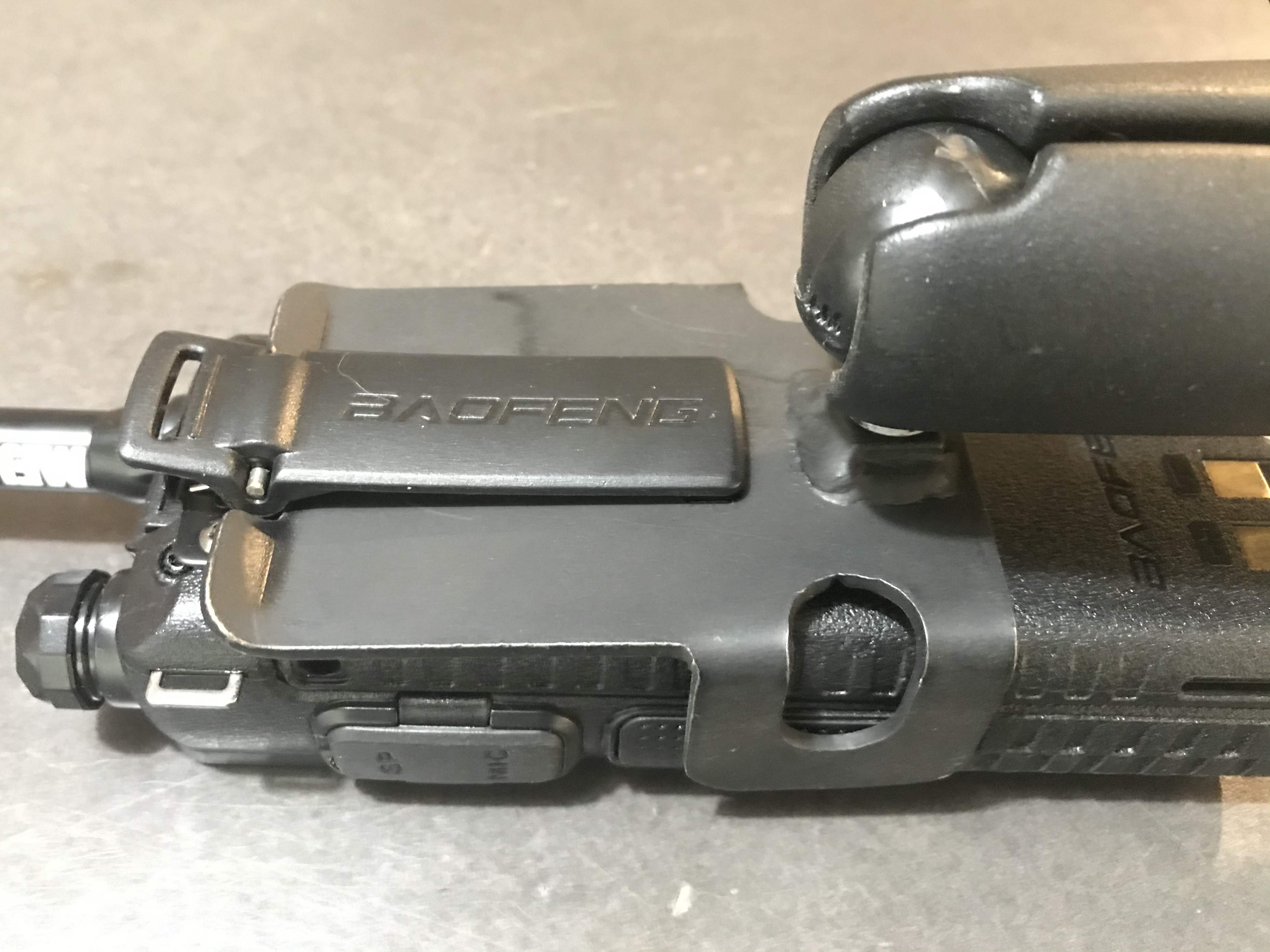 Here are some more pics of the painted hoslter and RAM hardware. In the second pic, the radio isn't completely inserted into the holster so you can see the hole where the clip latches. In the third picture, you can see how the clip seats fully into the holster. This keeps it held solidly while bouncing along Forest Service roads.