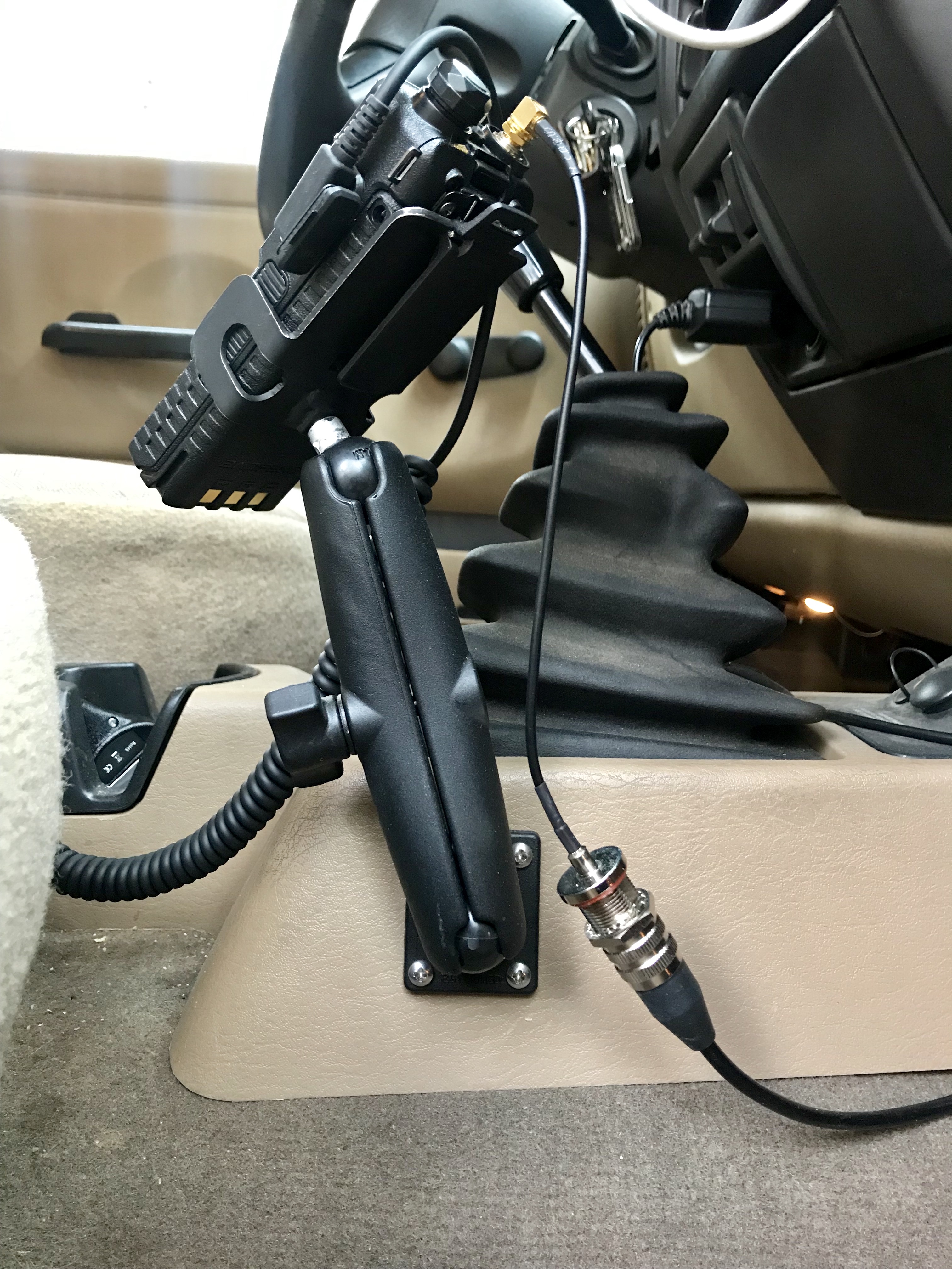 The third picture above shows how much clearance I have when I put the Jeep in reverse--just enough where I don't bump the radio. But I can stick the hand mic onto the Velcro at any angle and the radio is adjustable at the RAM mount, so you could make room for it no matter how big your hands are. I just wanted it to be as close as possible so passengers wouldn't hit the radio with their knees.