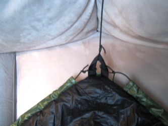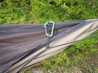 I'm still concerned about the minibiner that sits on top of the HH ridgeline, rubbing on the bugnet. Patrick addresses this on the webpage, but I still think it might rub a hole into the bugnet with prolonged use. Since the loops are already on the attachment quilt, I think a piece of shockcord with cordlock toggles could replace the minibiner. This would reduce the friction on the bugnet and might even save a few grams.