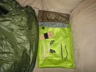 I received a cardboard box containing the quilt, a mesh stow bag, a stuff sack, 4 small cord loops (2 needed for attachment - choice of 2 colors provided), 2 mini-carabiners, illustrated instructions, and a repair kit [3 cordlocks (.25 oz, 8 g each), yarn for quilting loops, and a cardboard pattern to ensure proper yarn length]. Oh, and a package of little plastic dinosaurs (not pictured)...they don't help keep me warm, but I guess they Kickass anyway...